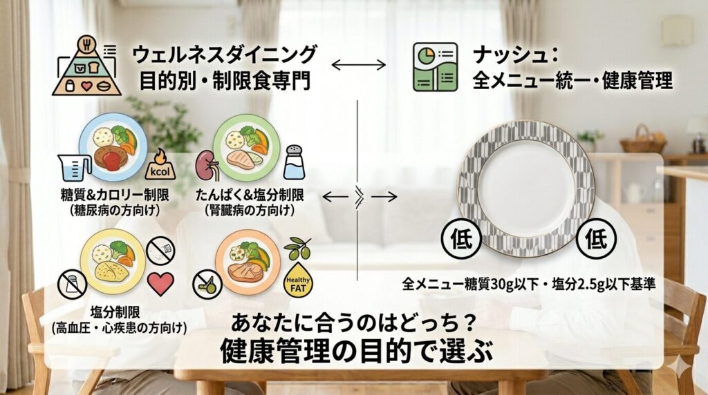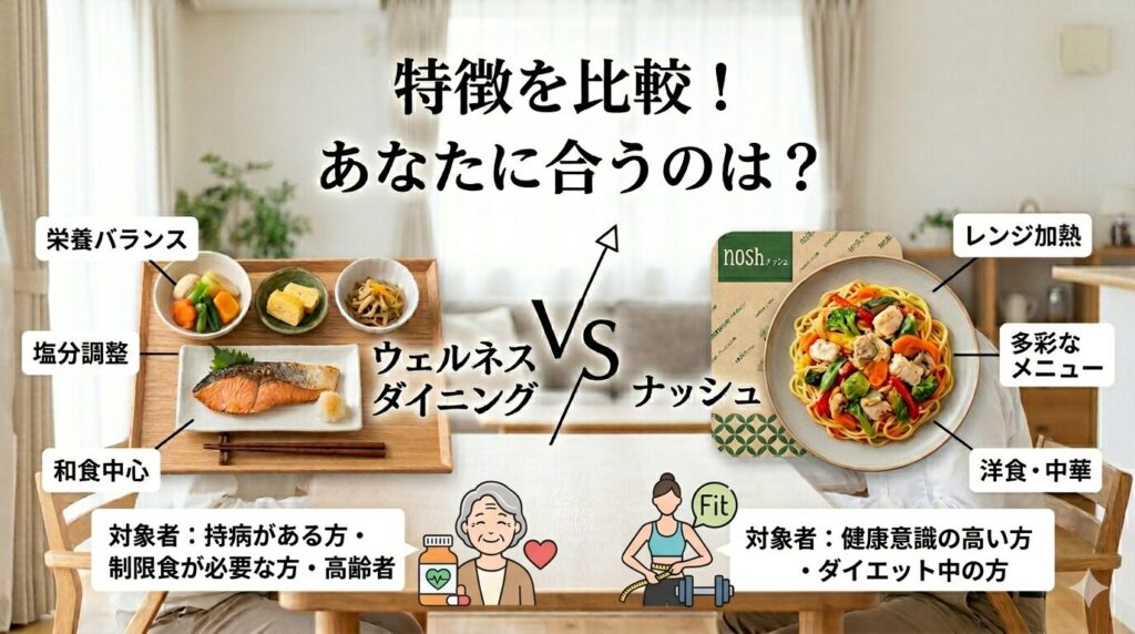 ウェルネスダイニングとナッシュは、どちらも管理栄養士が関わる優れた宅配食サービスですが、そのアプローチはまったく異なります。